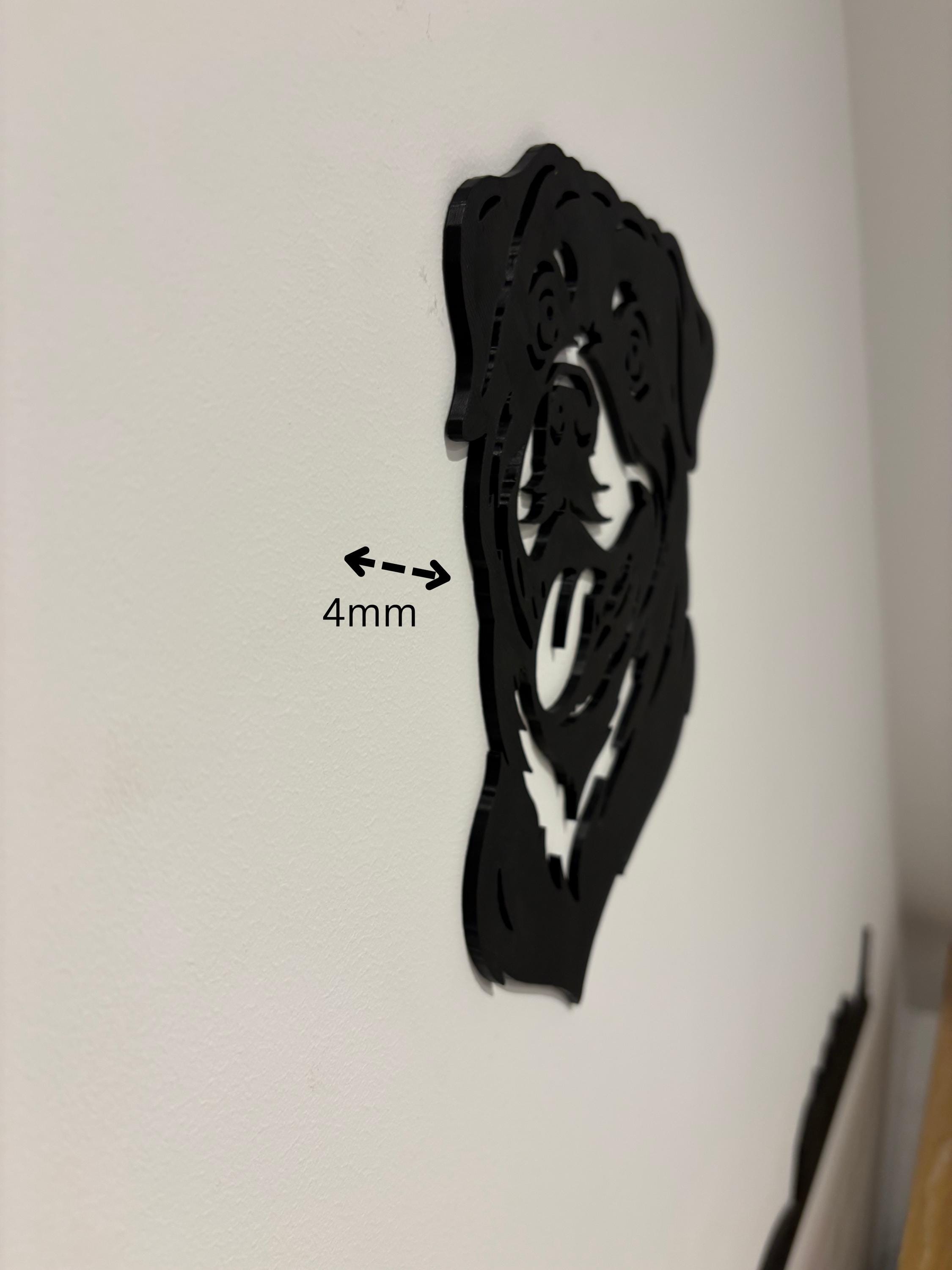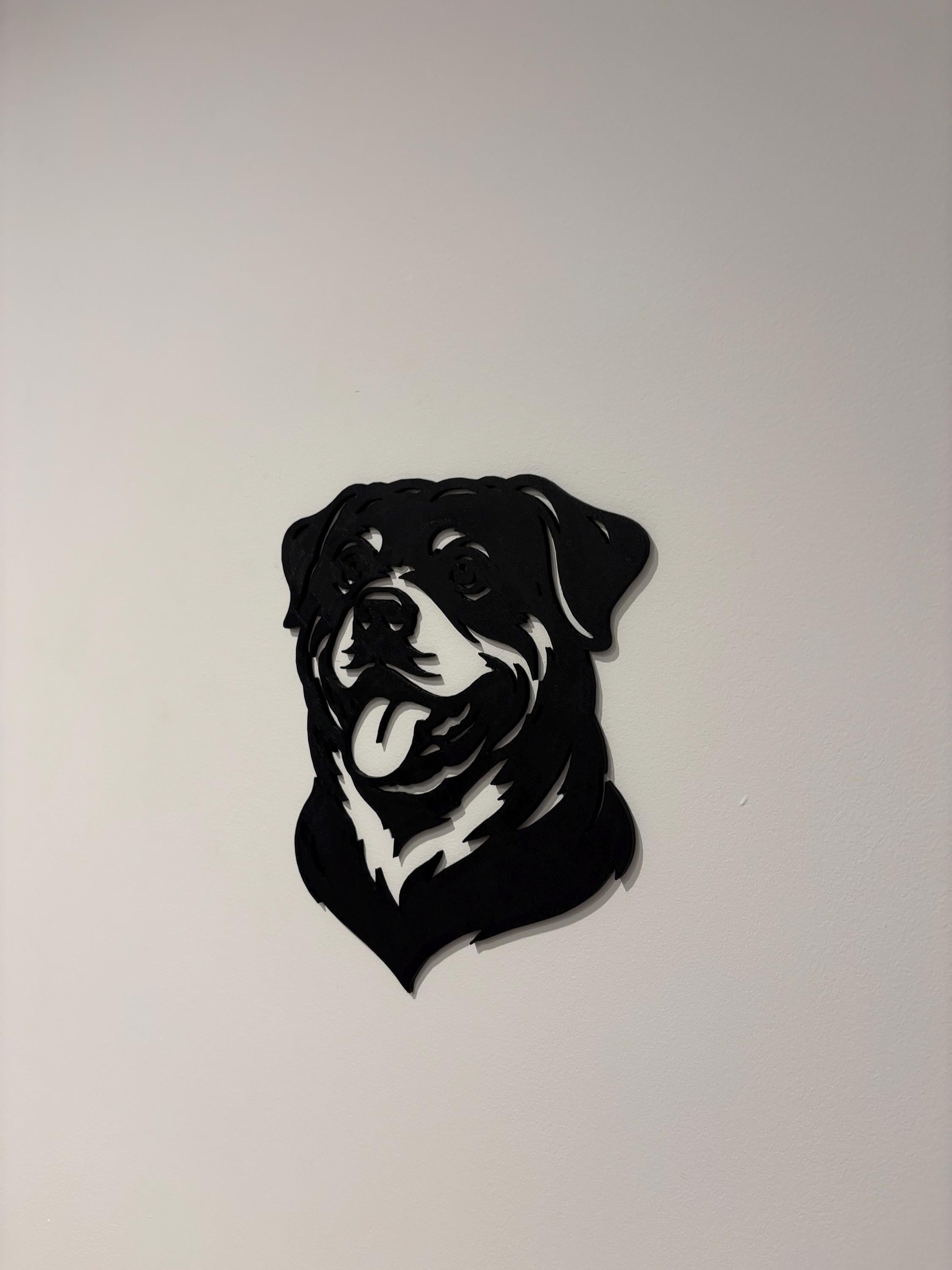Rottweiler wall art piece, comes pre-taped ready to be placed on the wall. Dimensions are 255mm x 210mm x 4mm. Colour black. 3D printed made of high quality PLA filament.